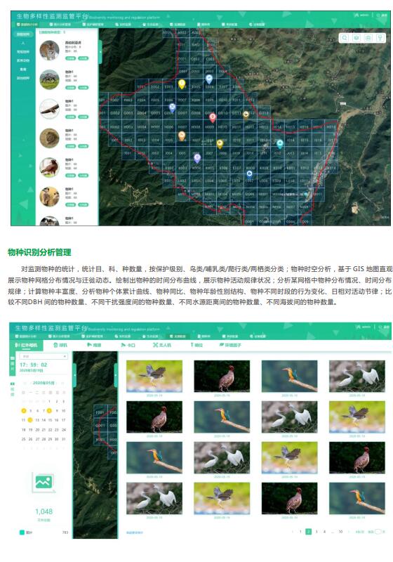 生物多样性监测监管系统包括数据统计分析、图片分析管理、巡护调研管理、实时监测、生态监测、监测数据、物种库等多种 应用。